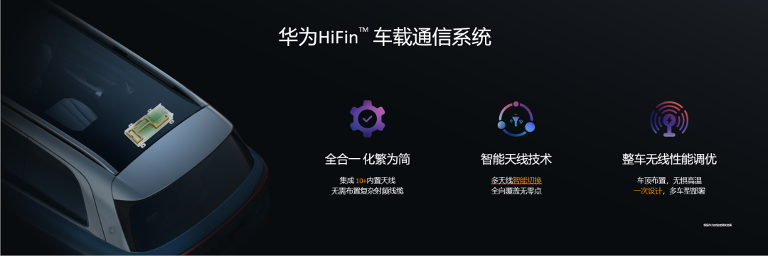 这套系统整合了车上对外通信各个物理组件,将天线,线缆,T-Box整合成单一部件,华为将这个产品概念注册为HiFin™品牌。线缆的减少,不仅仅使整车减重降本,还消除了射频信号在线缆上的损耗。结合华为优异的天线设计,根据汽车和基站的相对位置自动进行天线切换,保证任何时候,都能收到最好的信号。华为还向车厂提供基于整车的无线性能调优服务,帮助车厂在车上找到最好的位置,形成跨车型一致的无线性能基线。一次设计,多次部署,性能最优。