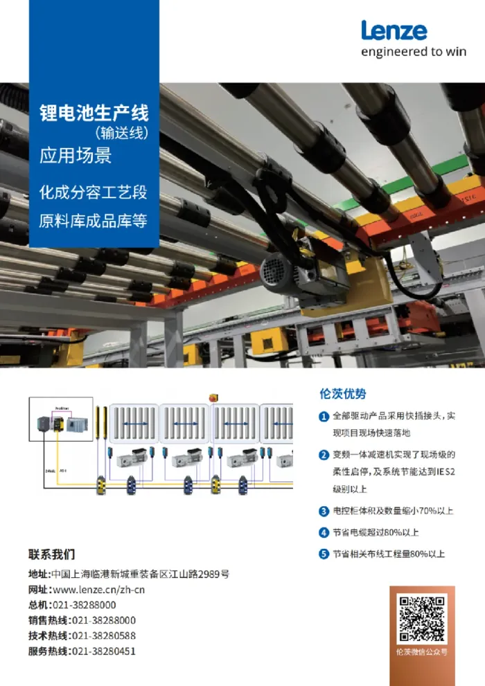 在此背景下,高效自动化解决方案成为企业构建核心竞争力的战略支点,而具备技术创新能力与全球化服务能力的企业将在新一轮竞争中占据先机。面对锂电池行业的挑战,作为驱动与自动化技术领域的专家,伦茨深耕锂电池产业链数十年,拥有深厚技术积累和全球化服务能力,致力于以创新的智能化解决方案,赋能锂电制造企业提升核心竞争力。